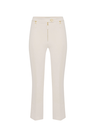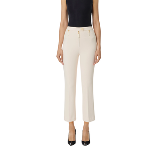 Pantaloni da donna realizzati in tessuto crepe. Vita alta, apertura con zip e bottone smaltato. I lati della vita sono caratterizzati da zip con dettagli in ecopelle. Gamba slim. 96% poliestere 4% elastan
