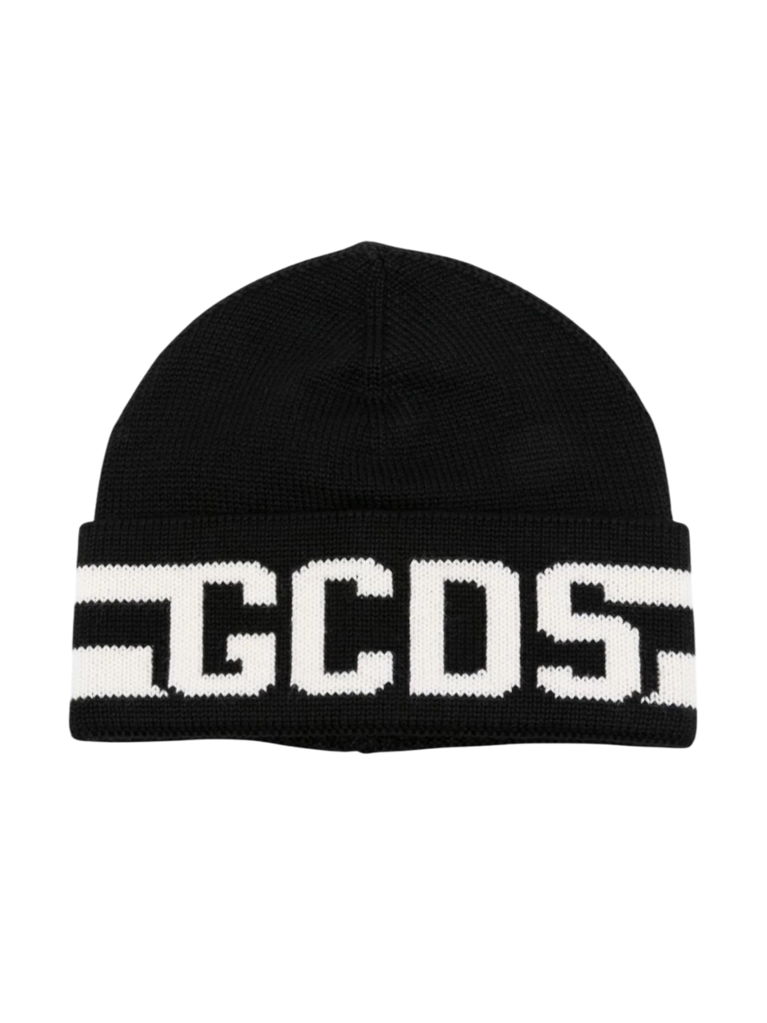 Cappello unisex da bambino realizzato in maglia a costine. Logo jacquard in contrasto di colore sul risvolto. 50% lana 50% acrilico