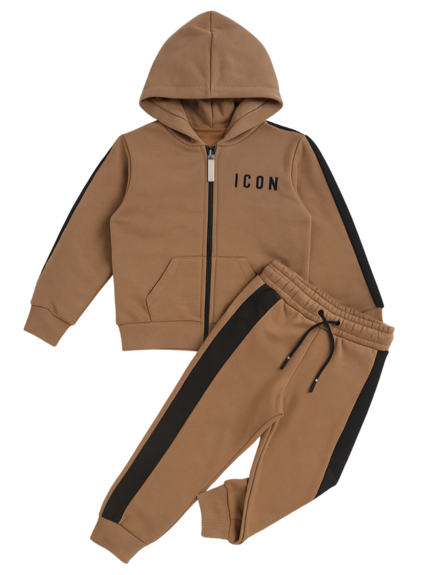 Completo da bambino composto da felpa e pantaloni. Felpa con zip e cappuccio. ande laterali in contrasto con logo jacquad sulle maniche. Pantaloni joggers con bande logate sui lati. Interno felpato. 65% cotone 35%poliestere