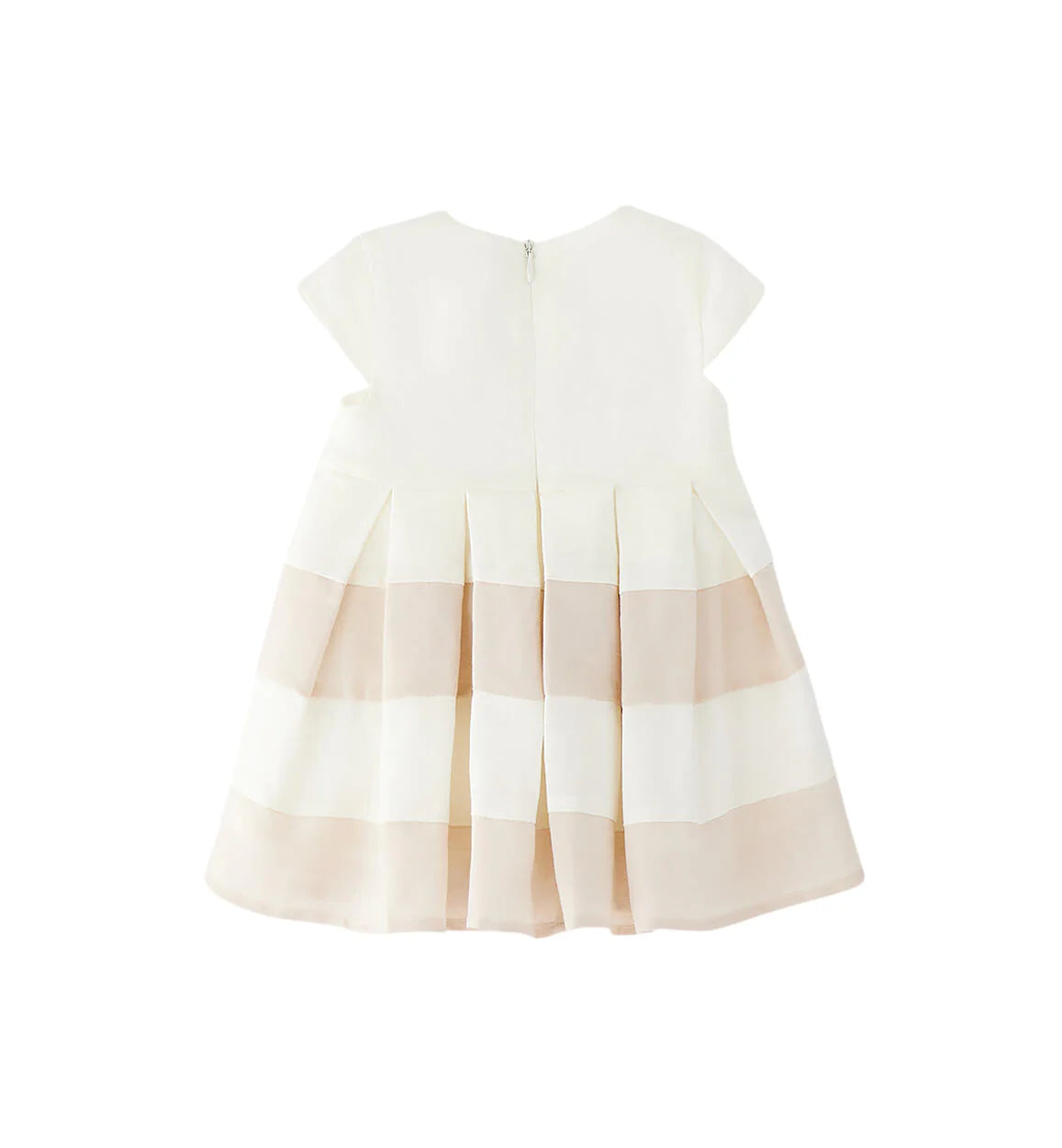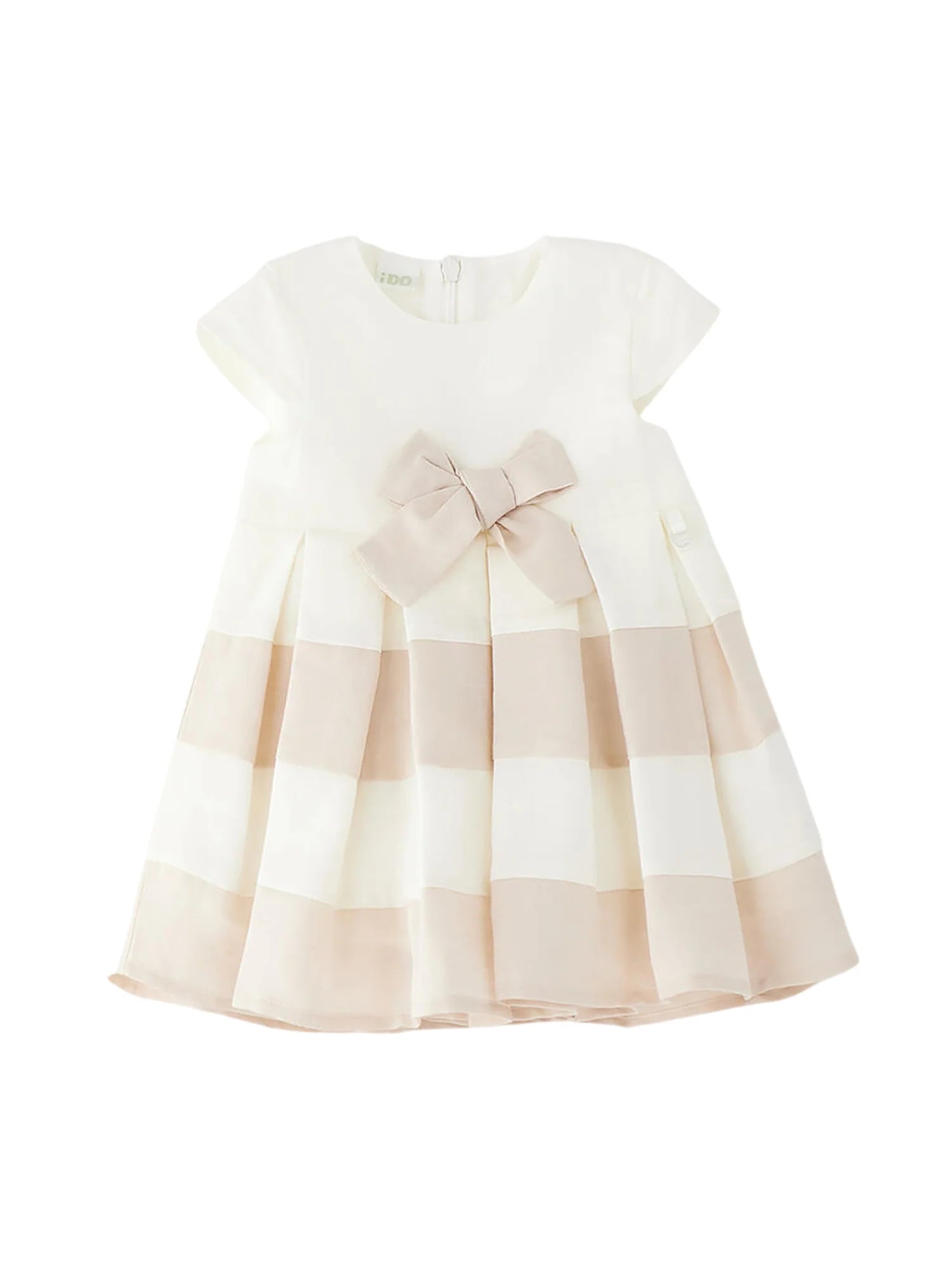 Abito elegante realizzato in tessuto misto lino. La gonna è caratterizzata da bande in contrasto di colore. Fiocco in vita. 64% lino 36% cotone