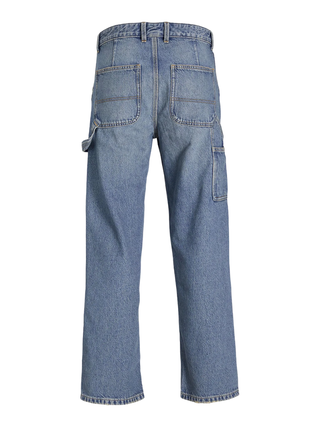 Jeans da uomo realizzati in denim di cotone rigido. Vita alta con passanti, modello 5 tasche. Gamba larga. Effetto used. 100% cotone
