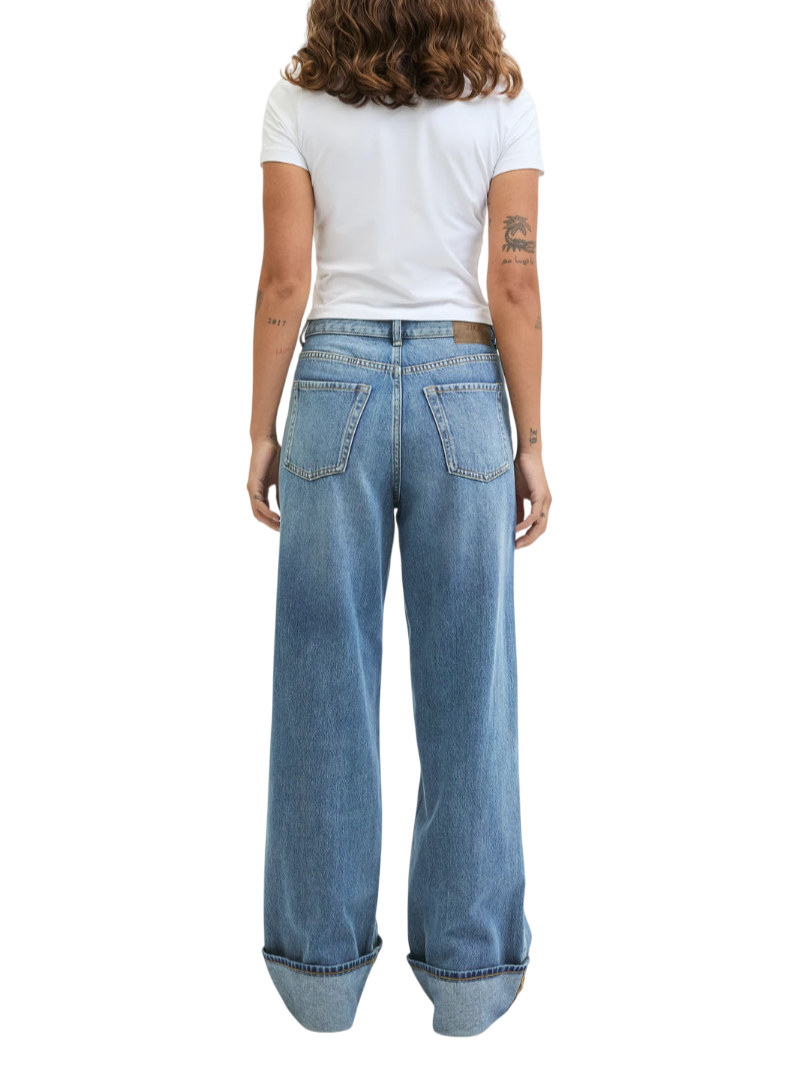Jeans da donna realizzati in denim di cotone. Effetto used. Vita alta, gamba larga. 95% cotone 5% elastan
