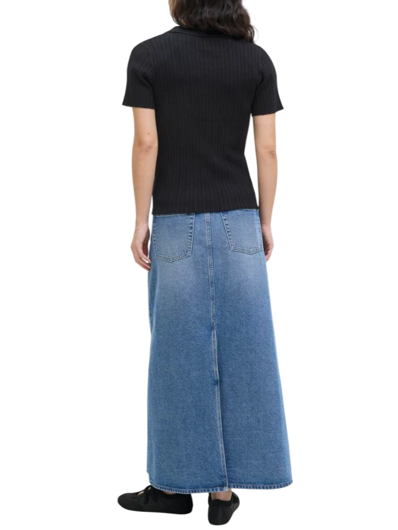 Polo da donna realizzata in tessuto misto viscosa a costine. Colletto classico, apertura con bottoncini. Maniche corte. Linea aderente. 82% nylon 18% viscosa