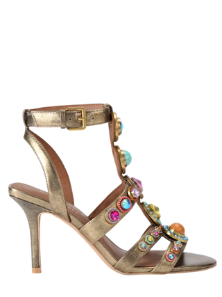 Sandali alti da donna realizzati in pelle. Tacco alto 8,5 cm. Le fascette in pelle sono impreziosite da applicazioni gioiello multicolor. Cinturino sulla caviglia. Tomaia in pelle Suola in gomma