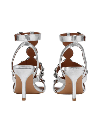 Sandali alti da donna realizzati in pelle. Tacco alto 8,5 cm. Le fascette in pelle sono impreziosite da applicazioni gioiello. Cinturino sulla caviglia. Tomaia in pelle Suola in gomma