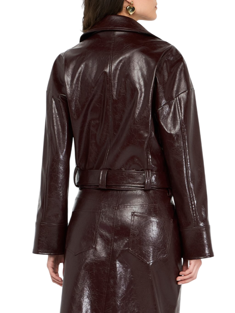 Giubbino stile biker da donna realizzato in ecopelle spalmata effetto lucido. Chiusura asimmetrica con zip, tasche sul davanti. Cintura tono su tono sul fondo. 100% poliestere