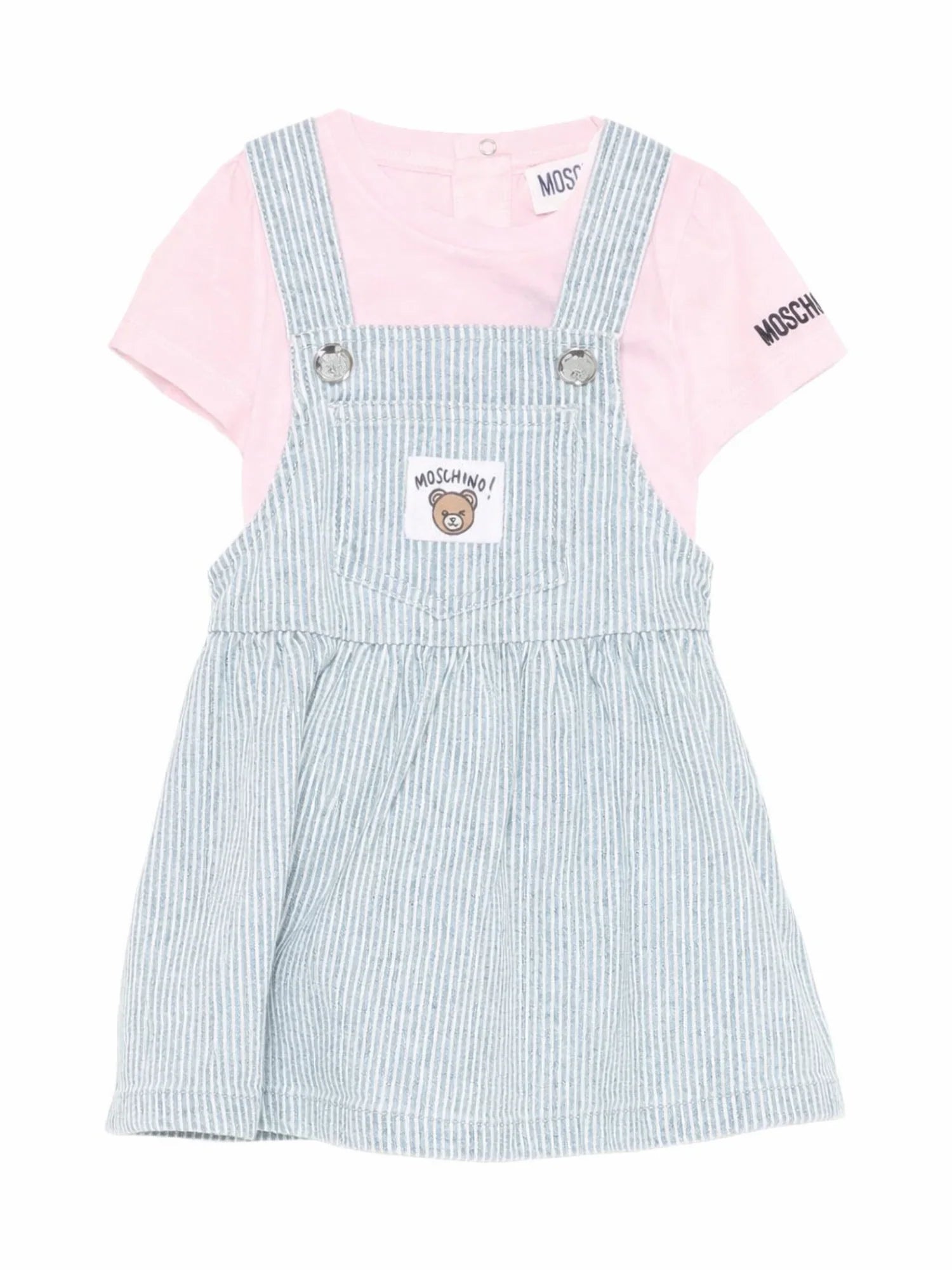 Completo da neonata composto da T-shirt e salopette. Salopette in denim a righe impreziosita da una tasca frontale con patch dell'orsetto Toy. T-shirt manica corta con stampa logo sulla manica. 100% cotone