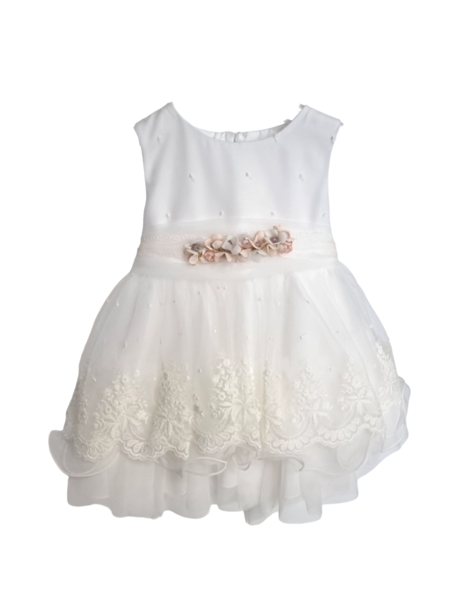 Abito da cerimonia per neonata realizzato in tulle. Modello senza maniche, scollo tondo. Il corpino è rivestito in tulle e presenta ricami a puntini. Chiusura con cerniera invisibile sul retro. Cintura in tulle con applicazioni floreali nei toni pastello sul davanti. La gonna è caratterizzata da strati di tulle e il più esterno presenta dei ricami tono su tono. L'interno della gonna è realizzato con strati di tulle e tessuto che donano volume al capo. Questo vestito è l'ideale per una baby damigella o per festeggiare un battesimo.63% cotone73% poliestere