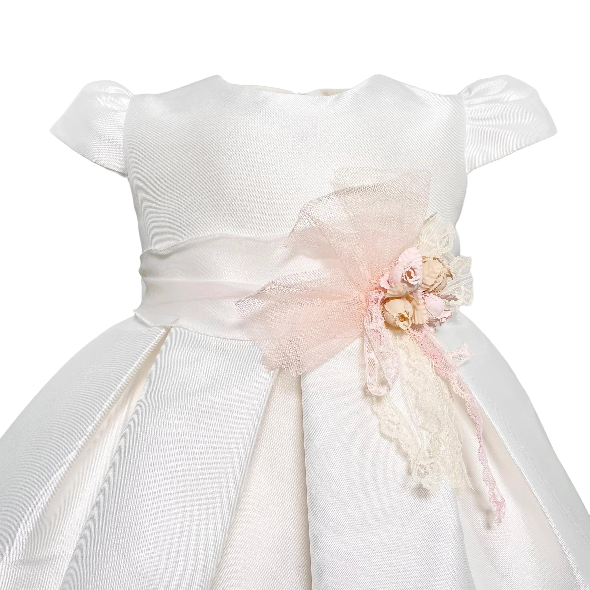 Abito da cerimonia da bambina in mikado. Manichine ad aletta. Cintina in vita con applicazione floreale.