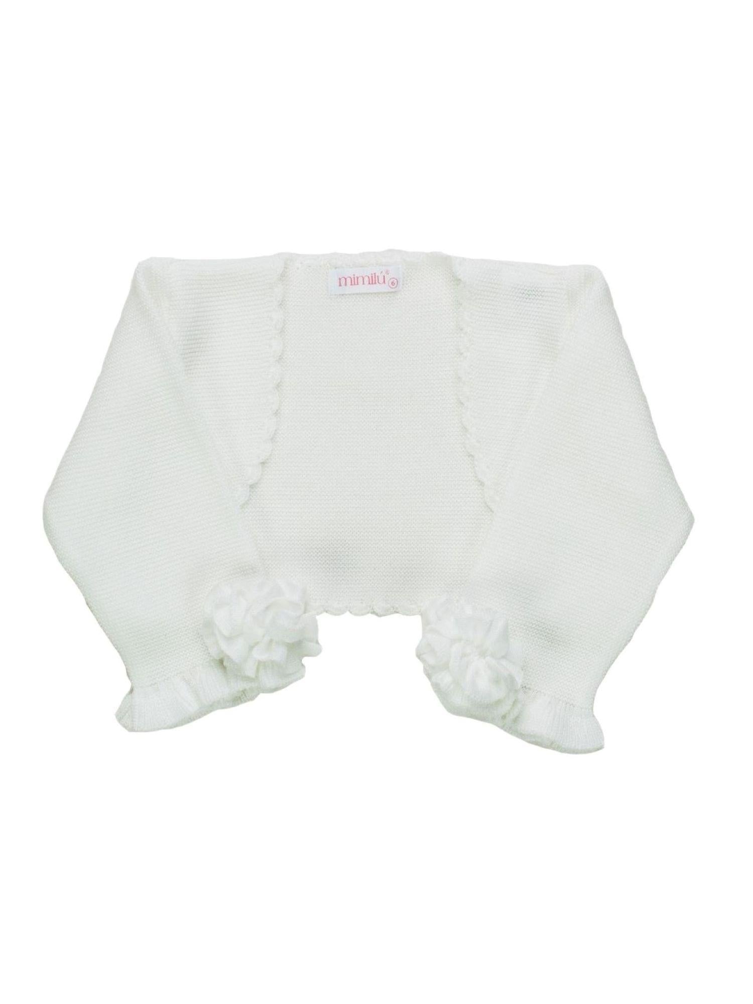 Coprispalle da bambina realizzato in maglia. Maniche lunghe, apertura frontale con orli lavorati a smerli. Il fondo delle maniche presenta delle rouches e applicazioni floreali nello stesso materiale e tonalità di colore.