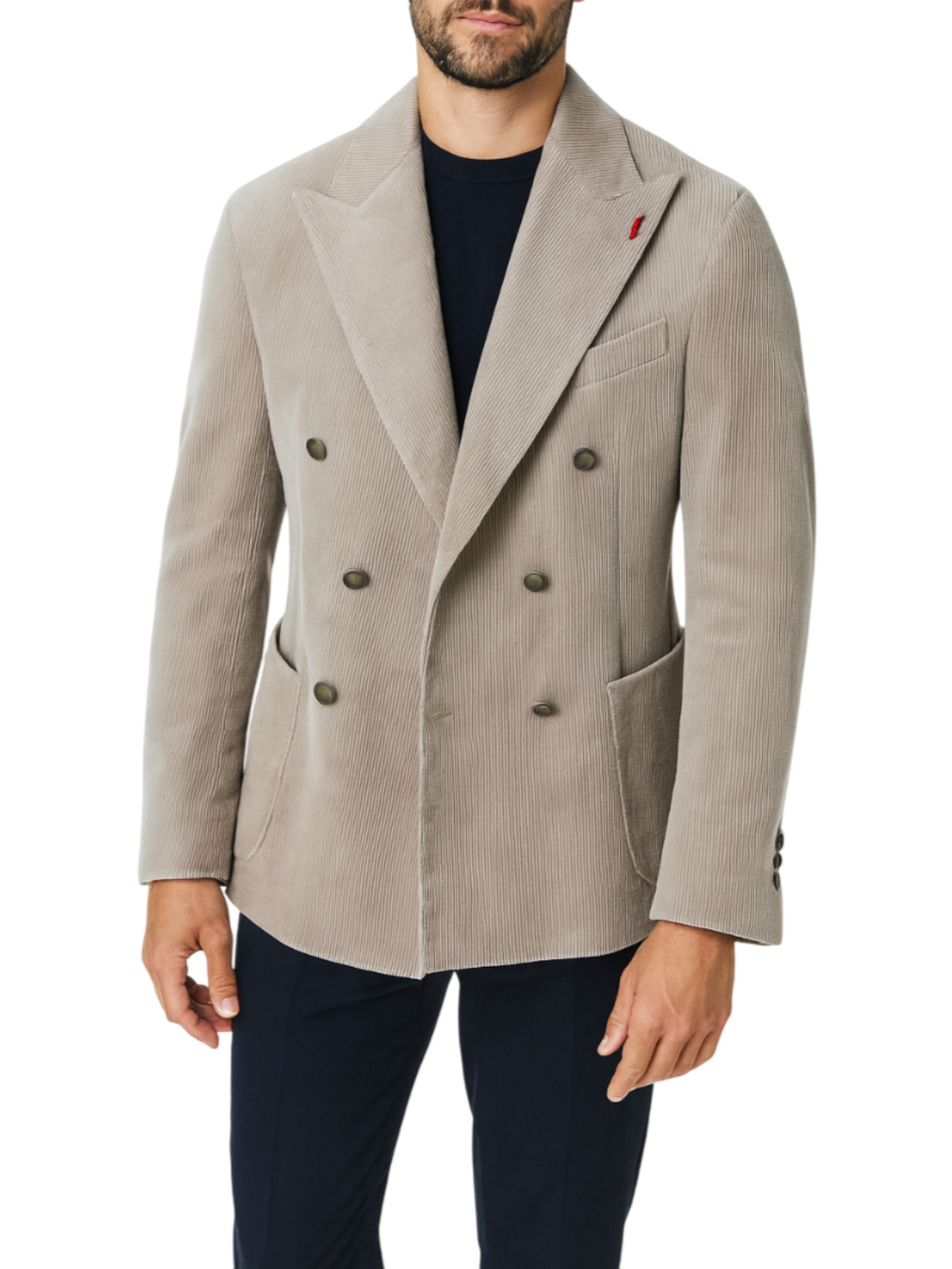 Giacca stile blazer da uomo in velluto millerighe. Abbottonatura doppiopetto con bottoni metallici. Collo con reveers a lancia, spilletta iconica sul collo. Tasche aperte sul davanti. 90% poliestere 10% elastan