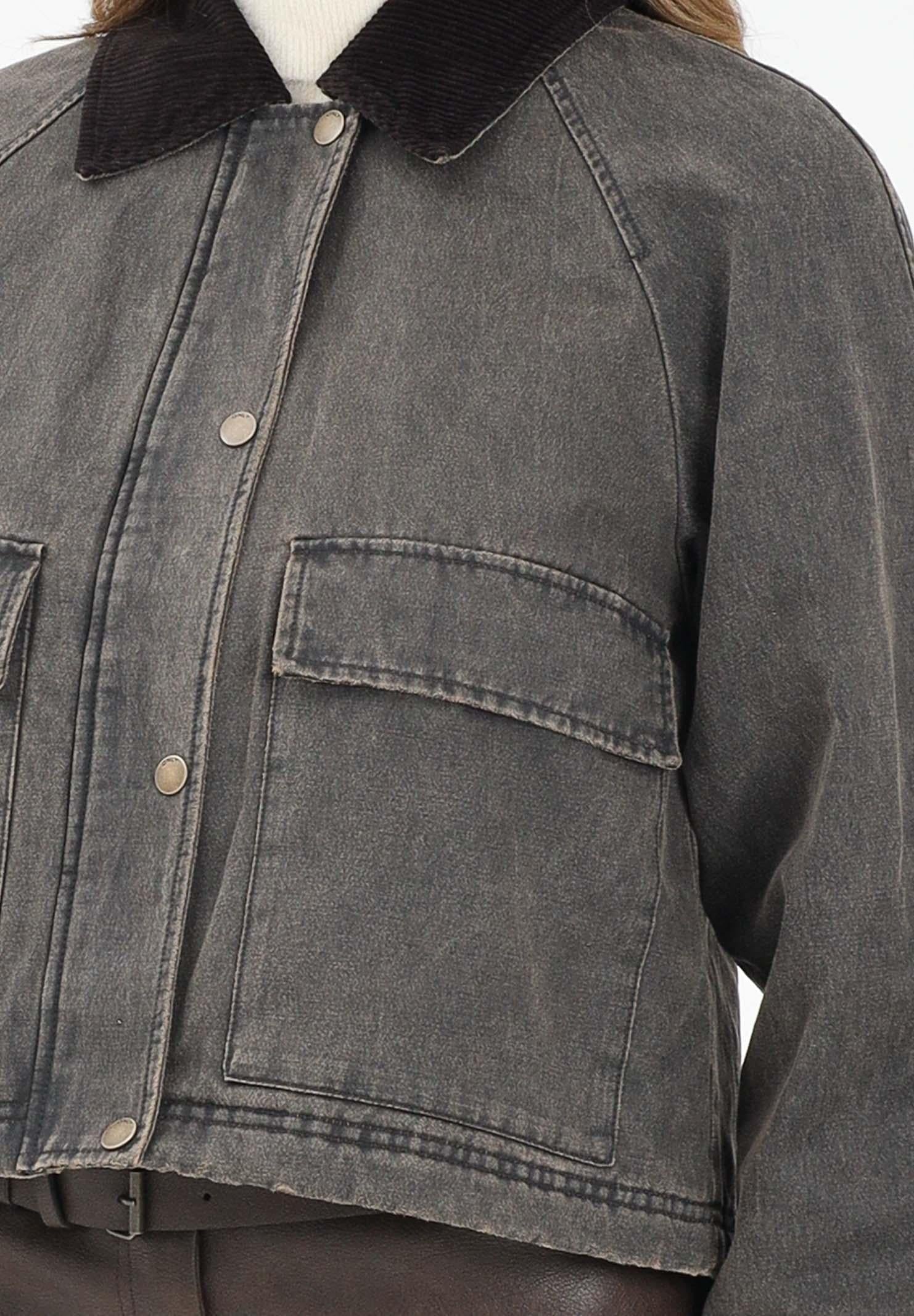 Giubbino imbottito da donna effetto denim used. Colletto in velluto millerighe. Tasconi con patta sul davanti. Chiusura con zip nascosta da patta richiudibile con bottoni automatici. Imbottitura in ovatta. 65% cotone 35% poliestere