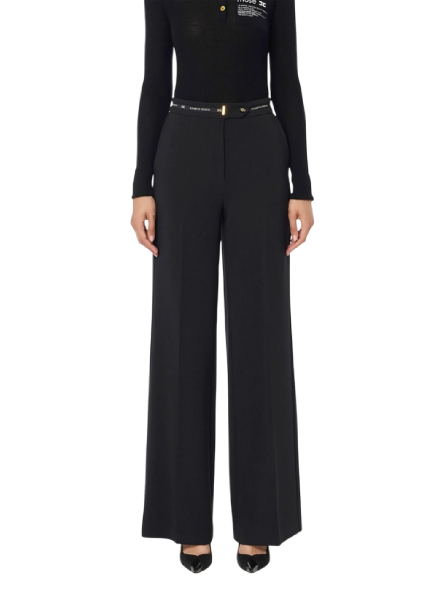 Pantaloni palazzo da donna realizzati in tessuto crepe. Vita alta caratterizzata da un nastro con logo all over. Tasche con patta sul retro. Gamba larga. Abbina questo pantalone ad una giacca blazer per un look formale adatto ad un evento di lavoro, un'occasione speciale o una cerimonia. 95% poliestere 5% elastan