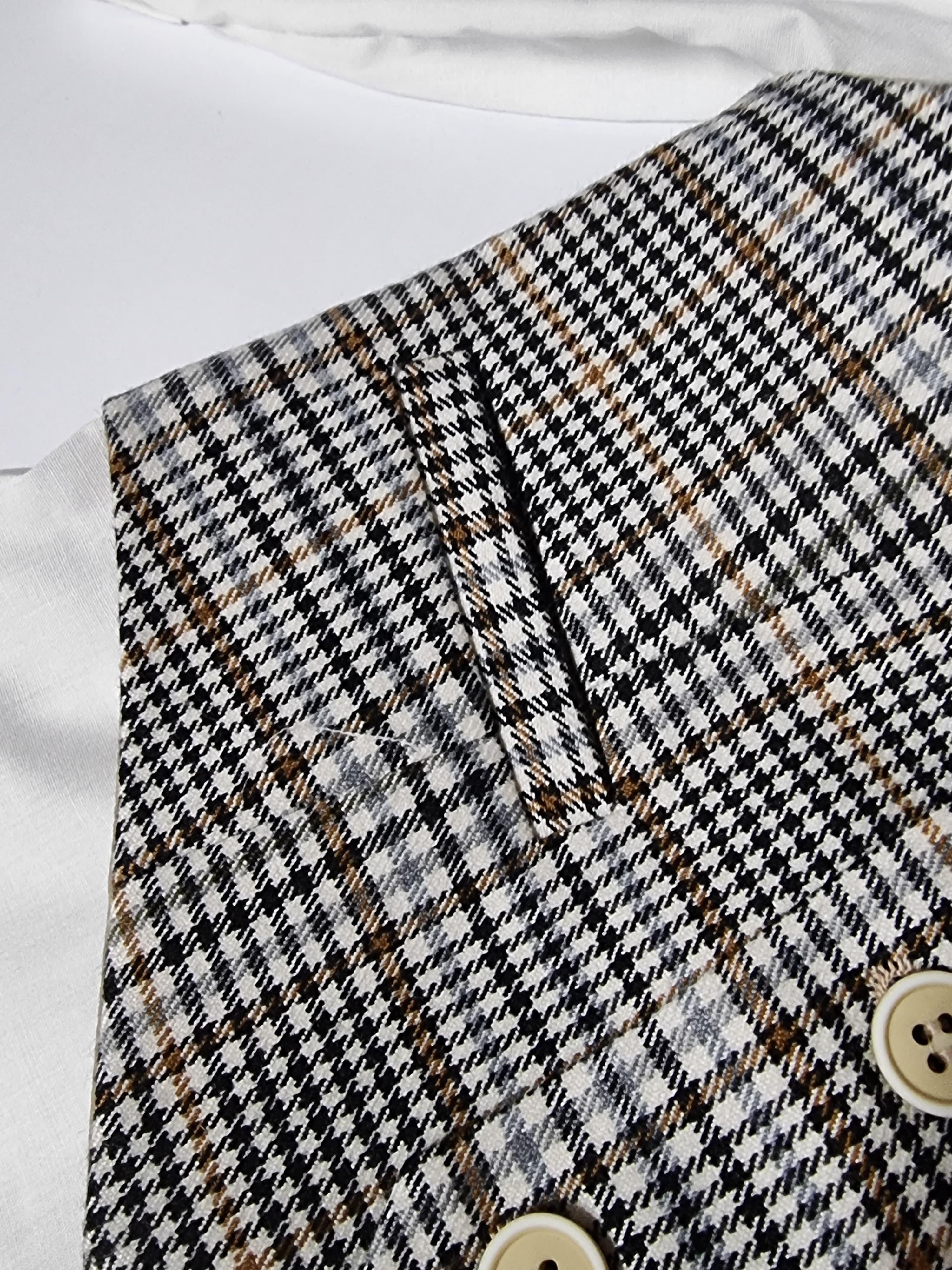 Completo elegante da neonato composto da camicia, pantaloni, gilet e papillon. Camicia manica lunga, gilet in fantasia scozzese. Pantaloni con risvolto sul fondo. Papillon in fantasia scozzese.Tessuto 97% cotone 3% elastan Tessuto 2: 72% poliestere 28% viscosa