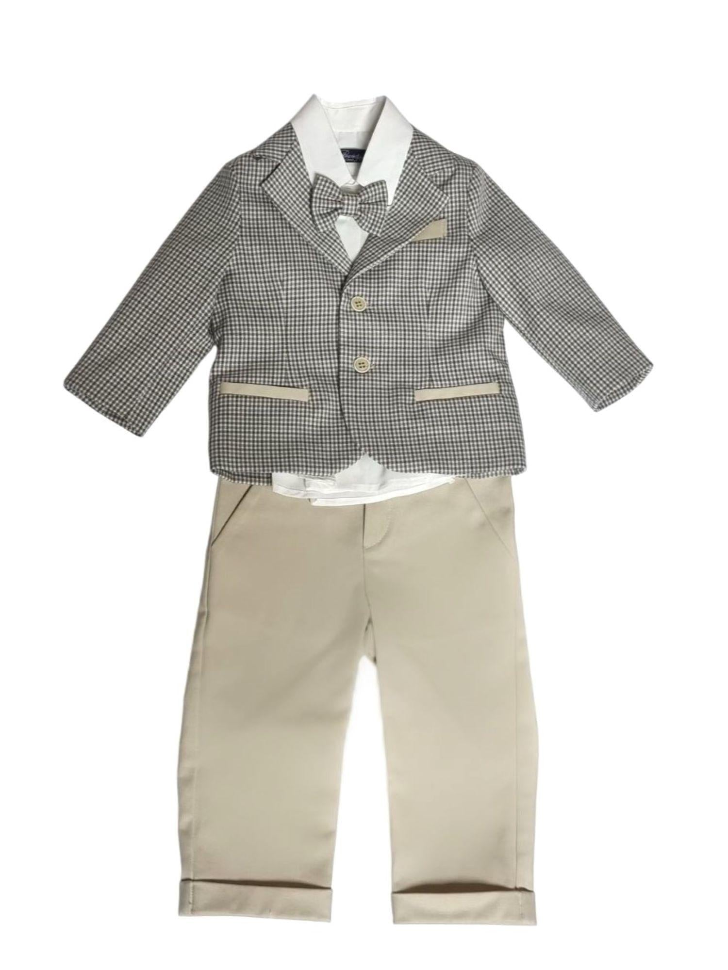 Completo elegante da neonato ideale per una cerimonia o un Battesimo. Giacca monopetto in fantasia Pied de Poule. Camicia maniche lunghe. Pantaloni con risvolto sul fondo. Papillon in fantasia Pied de poule.Tessuto 1 64% poliestere 24% viscosa 2% elastan Tessuto 2: 97% cotone 3% elastan
