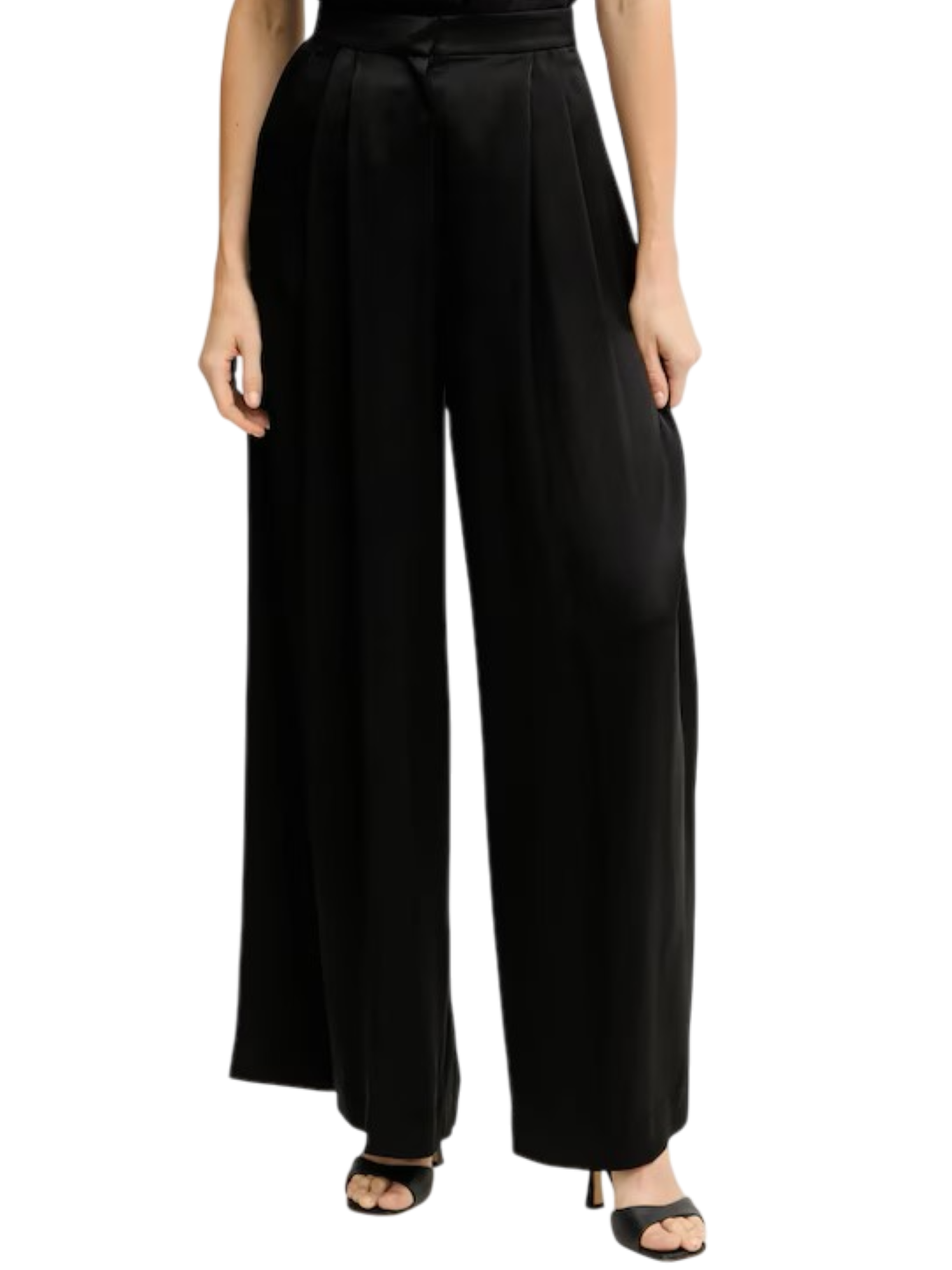 Pantaloni da donna realizzati in raso. Vita alta, tasche alla francese sul davanti, tasche a filetto sul retro. Gamba ampia e morbida. 91% acetato 9% poliestere