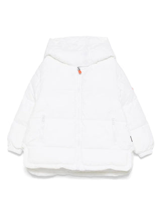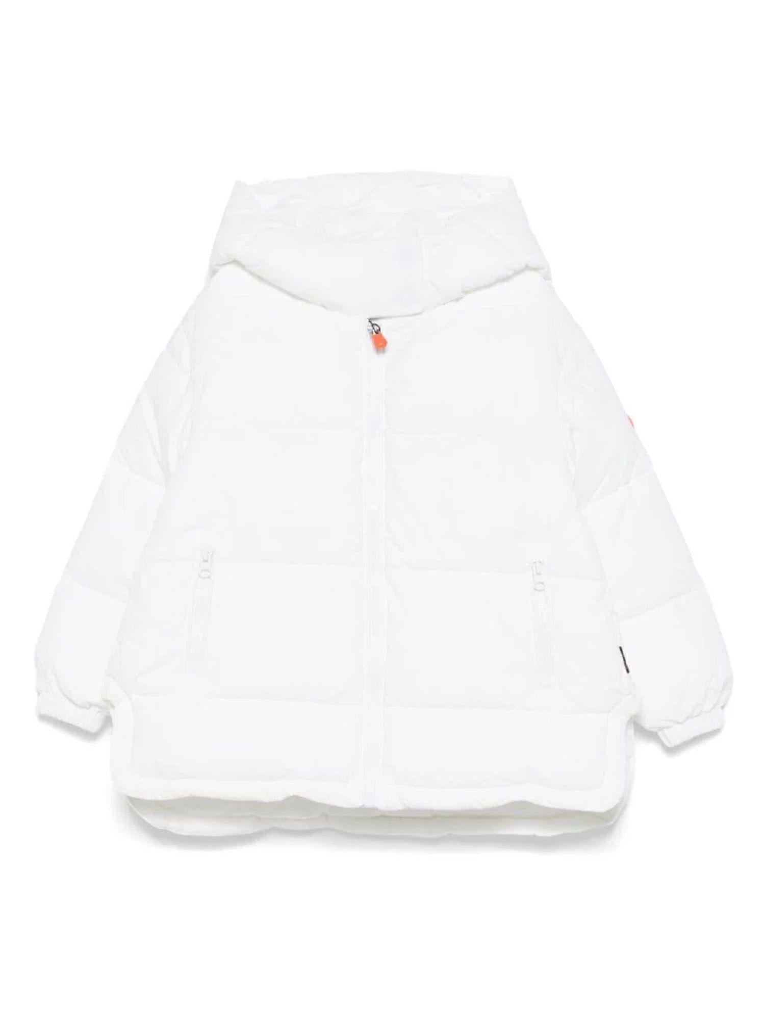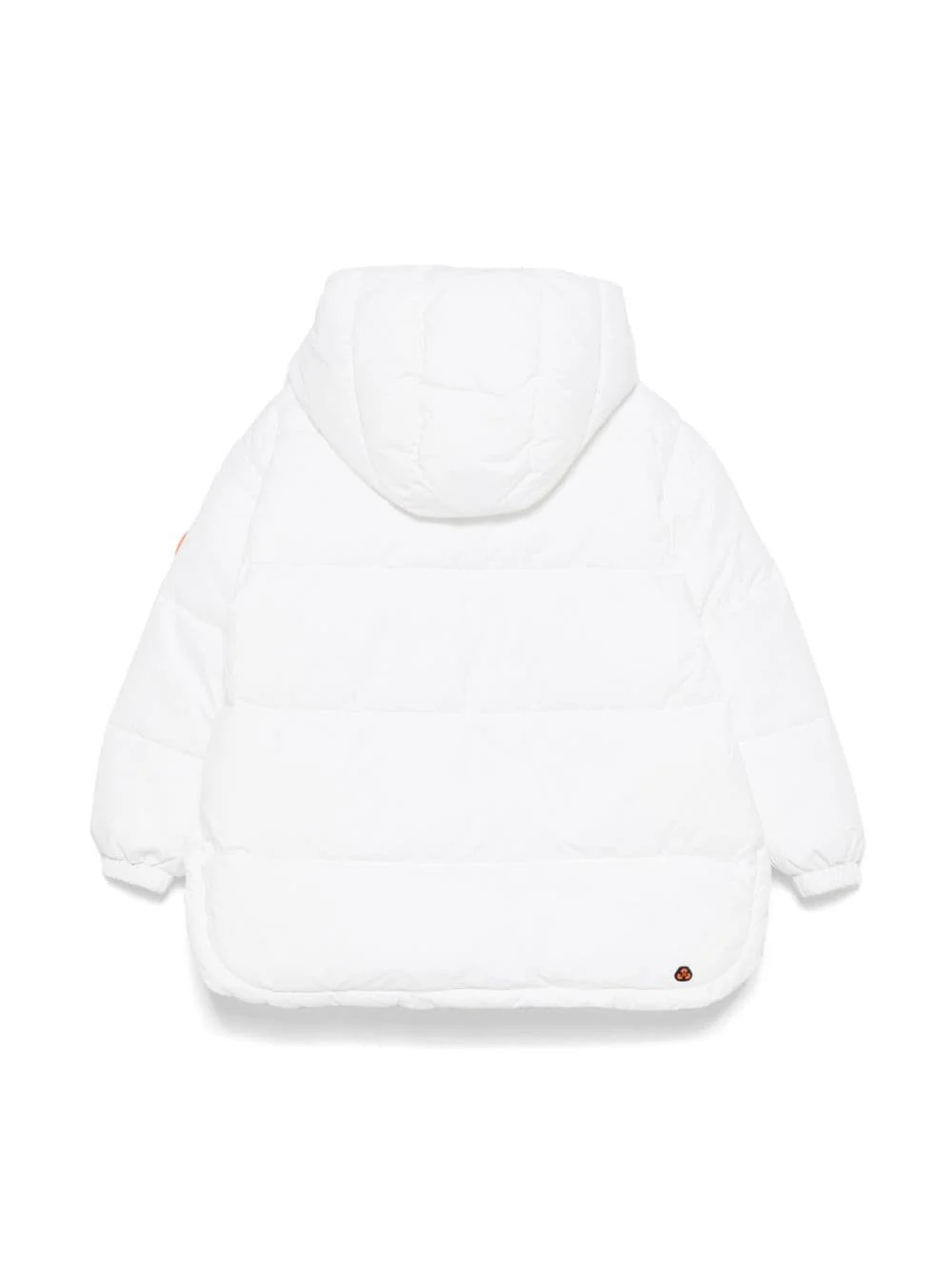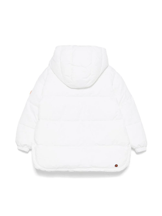 Piumino da bambina realizzato in nylon trapuntato. Collo alto con bottoncini sul davanti, cappuccio fisso. Imbottitura in ovatta.100% poliestere