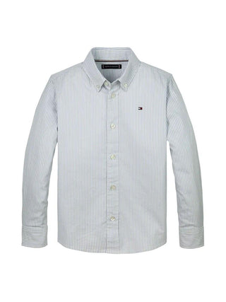 Camicia da bambino in fantasia a righe. Colletto classico, maniche lunghe. Ricamo della bandierina iconica sul petto. 97% cotone 3% elastan
