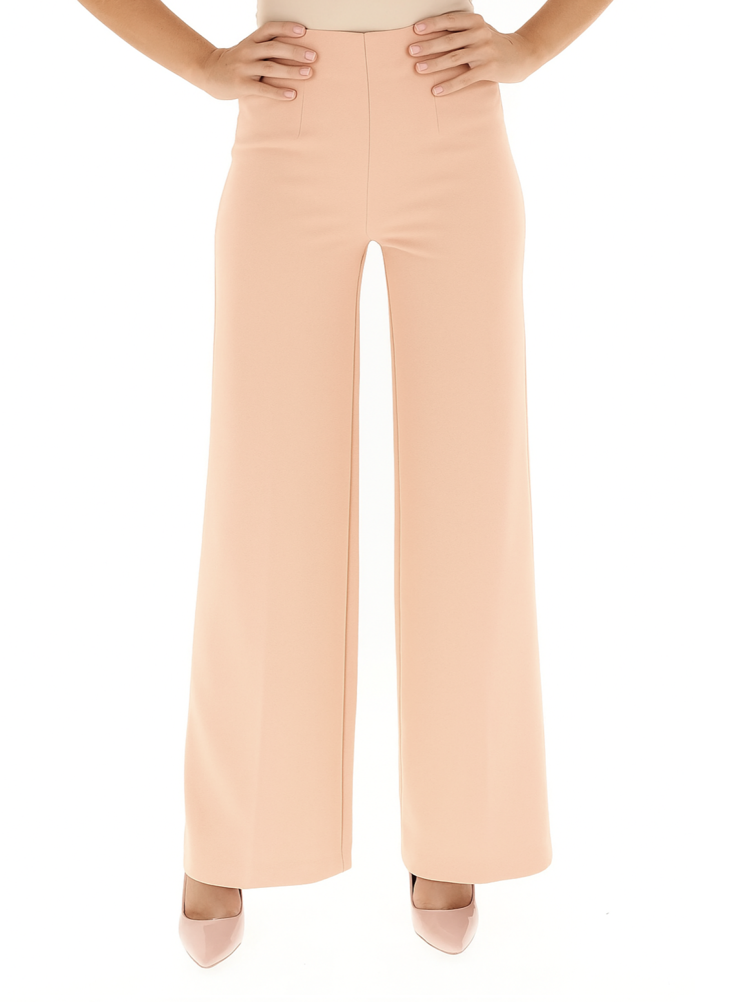 Pantaloni palazzo da donna realizzati in tessuto crepe stretch. Vita alta, chiusura laterale con cerniera. Gamba larga. 95% poliestere 5% elastan