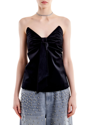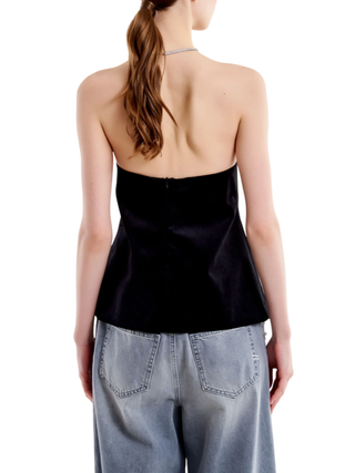 Top da donna realizzato in velluto. Modello smanicato, scollo a V con ferretti all'interno. Fiocco sul davanti, apertura con zip sul retro.62% acetato 38% poliestere