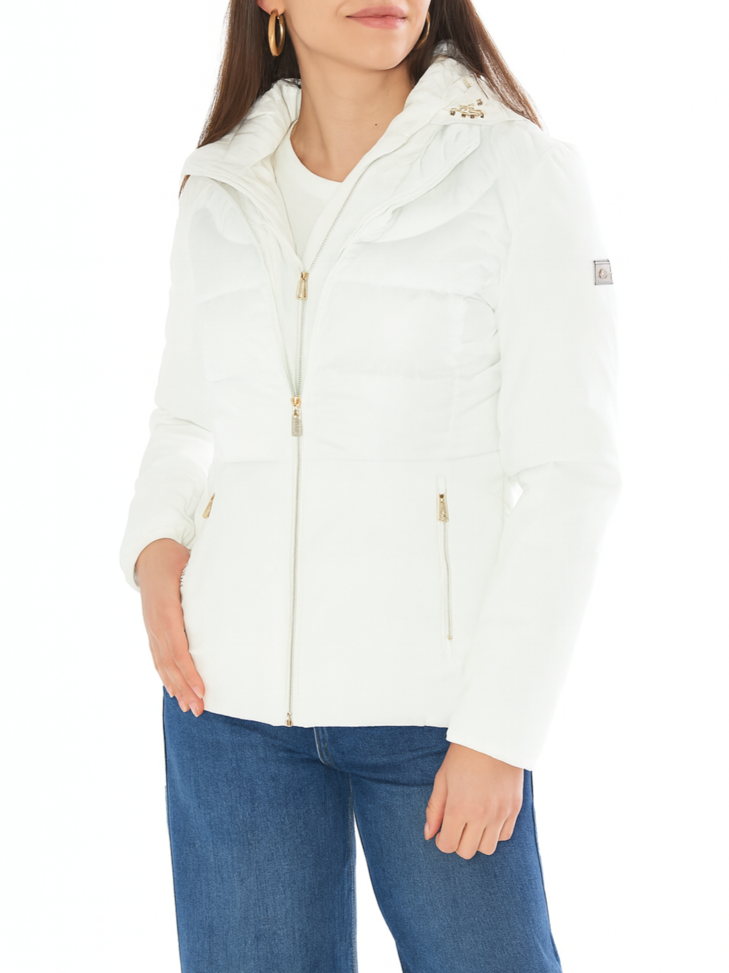 Giubbino imbottito corto da donna realizzato in nylon trapuntato. Cappuccio con coulisse, paramontura interna rimovibile con zip. Chiusura frontale con cerniera, tasche con zip sul davanti, patch logato sulla manica. Imbottitura ecologica. Le maniche sono realizzate in tessuto tecnico. Vestibilità regolare.Tessuto esterno: 100% poliestereImbottitura: 100% poliestere