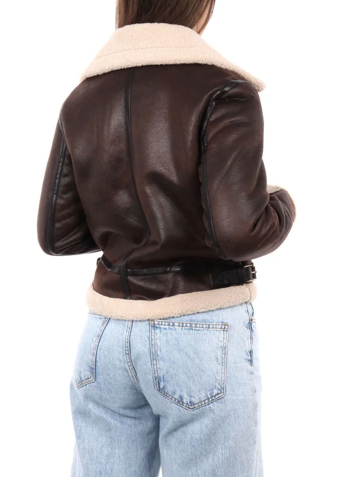 Giubbino da donna stile montoncino ecologico. Collo, polsini e fondo in tessuto Teddy in contrasto di colore. Apertura frontale con cerniera. Interno in tessuto Teddy. 100% poliestere