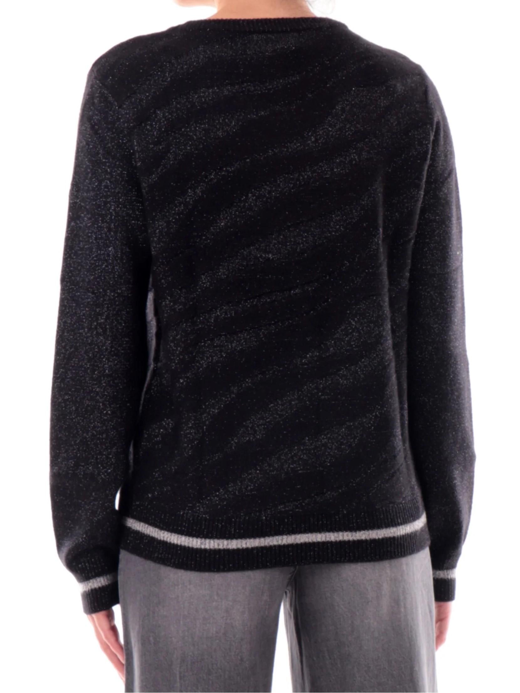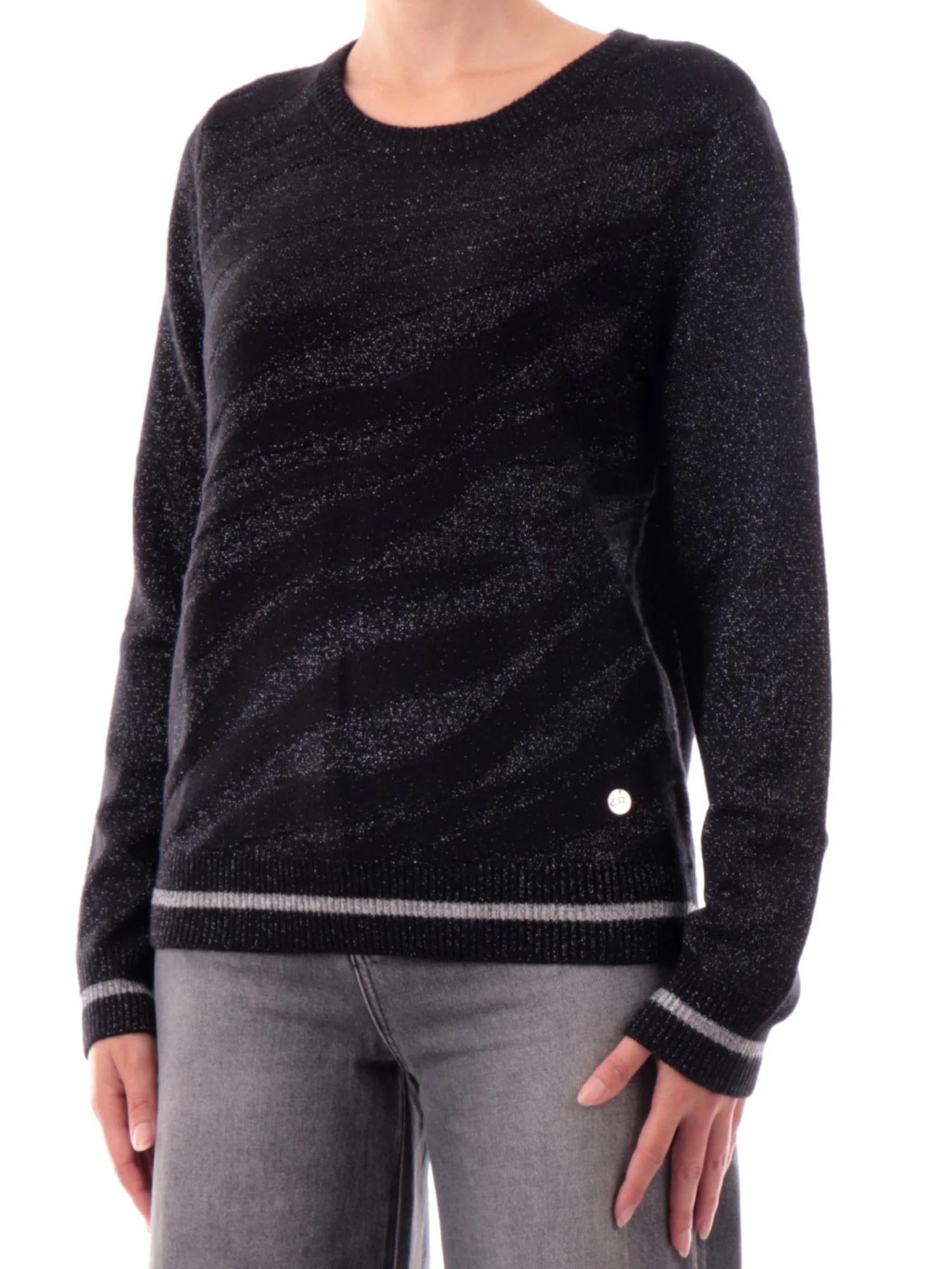 Maglia da donna realizzata in misto viscosa lurex. Inserti in contrasto di colore su maniche e fondo. 40% poliestere 38% viscosa 15% poliammide 7% fibra metallica